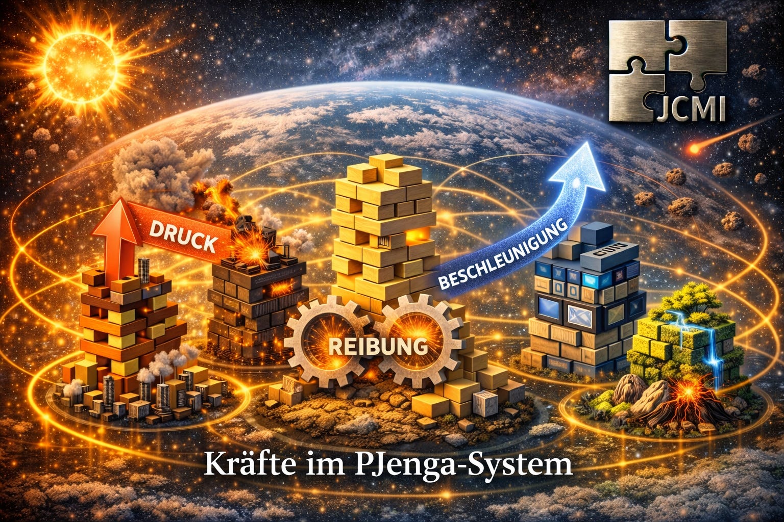 Wie sich das PJenga-System entwickelt, hängt maßgeblich vom Zusammenspiel aus Druck, Reibung und Beschleunigung ab.