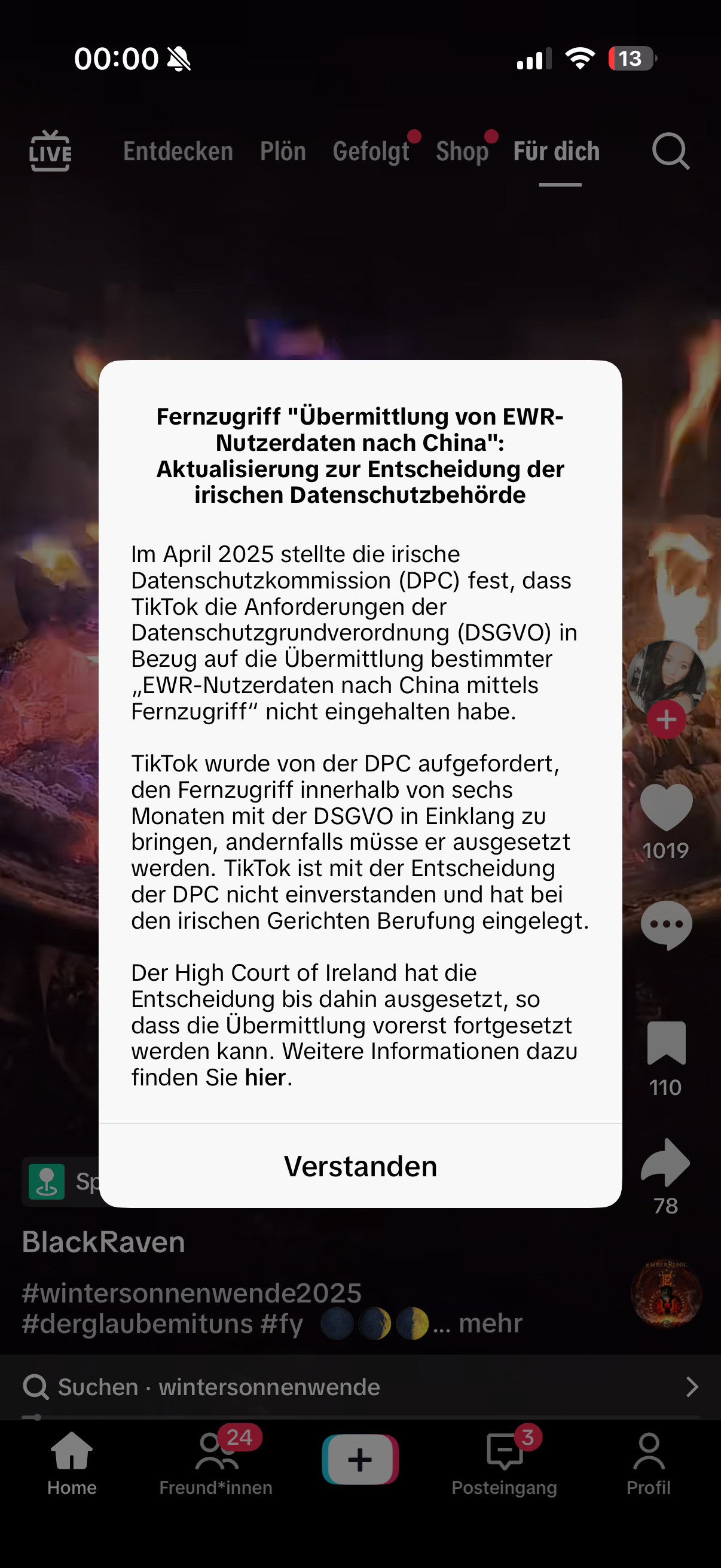 TikTok teilt mir mit, dass die irische Datenschutzbehörde (DPC) festgestellt hat, dass EWR-Nutzerdaten per Fernzugriff aus China zugänglich gemacht wurden – und zwar nicht DSGVO-konform. TikTok habe dagegen geklagt. Ein Gericht habe die Anordnung vorläufig ausgesetzt. Deshalb gehe alles erst einmal weiter wie bisher.