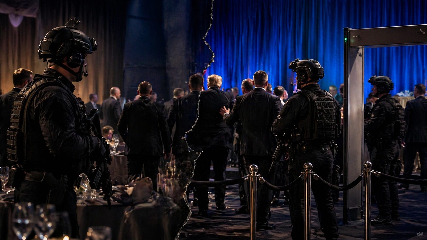 A sitting president attending the White House Correspondents’ Dinner is not a normal dinner. It is a symbolic target: media, government, celebrity, political anger, television optics, and national trauma compressed into one room.