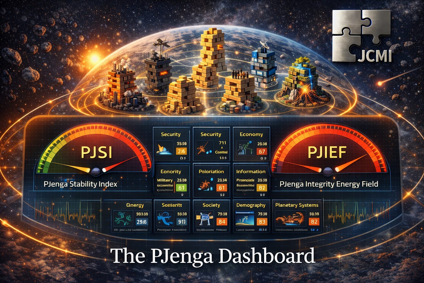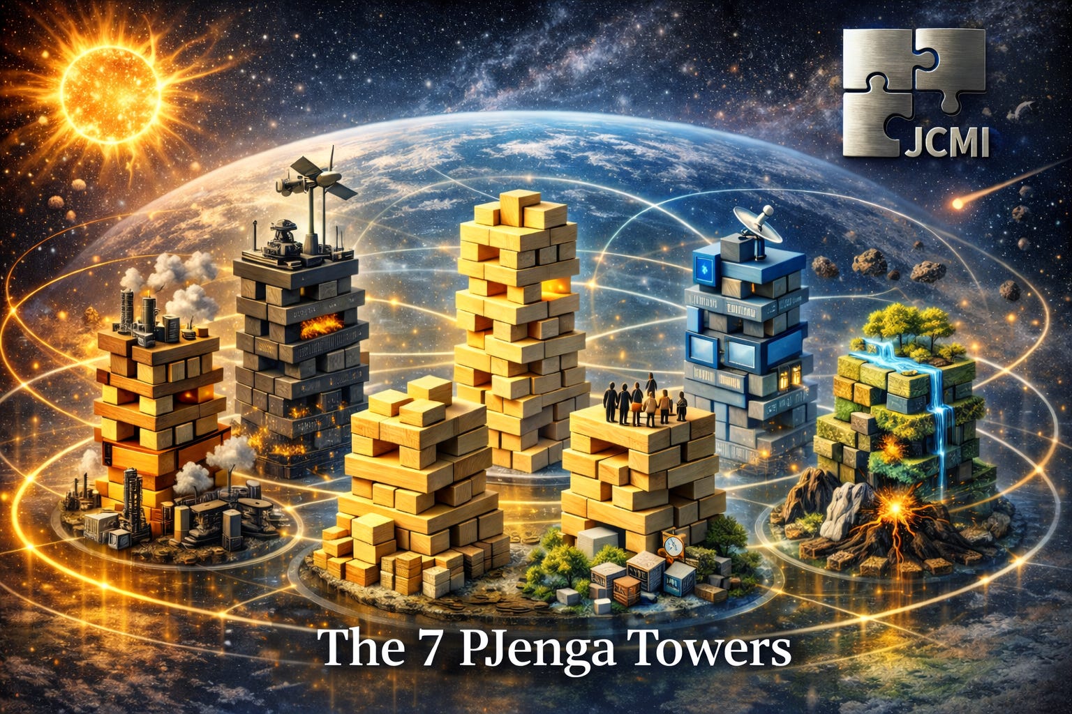 The PJenga Framework is a conceptual model for analyzing complex global systems. It uses the metaphor of interconnected Jenga towers to describe how modern civilization is structured and how instability propagates through it.